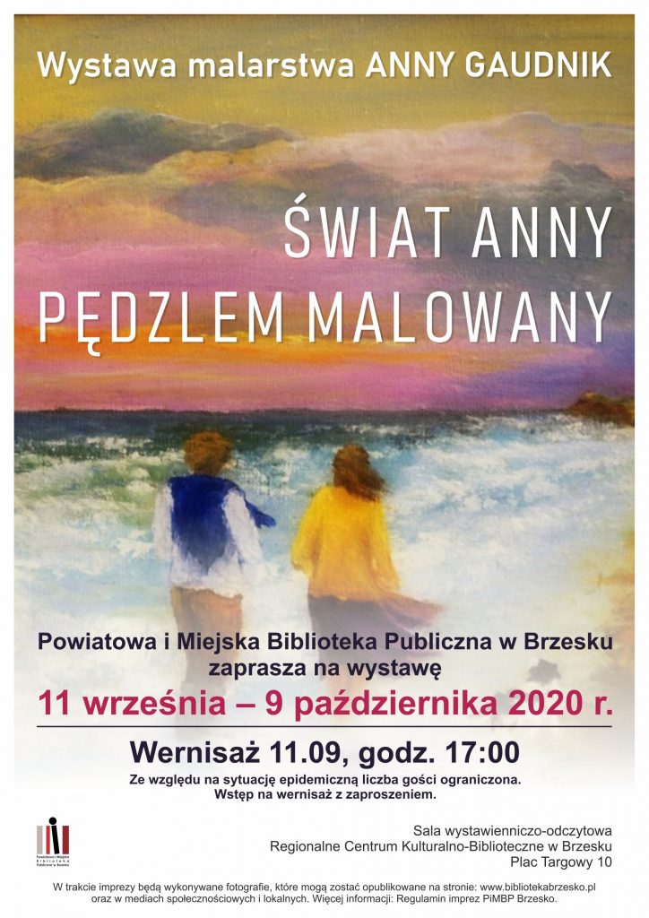 Powiatowa i Miejska Biblioteka Publiczna w Brzesku zaprasza do zapoznania się w wystawą malarstwa brzeskiej artystki Anny Gaudnik, pt. „Świat Anny pędzlem malowany”. Anna Gaudnik jest farmaceutką i aktywną studentką Uniwersytetu Trzeciego Wieku. W wolnych chwilach pisze wiersze, maluje, zajmuje się grafiką komputerową czy fotografią. Ekspozycja obejmować będzie jej prace malarskie, głównie pejzaże wykonane farbami akrylowymi i olejnymi.