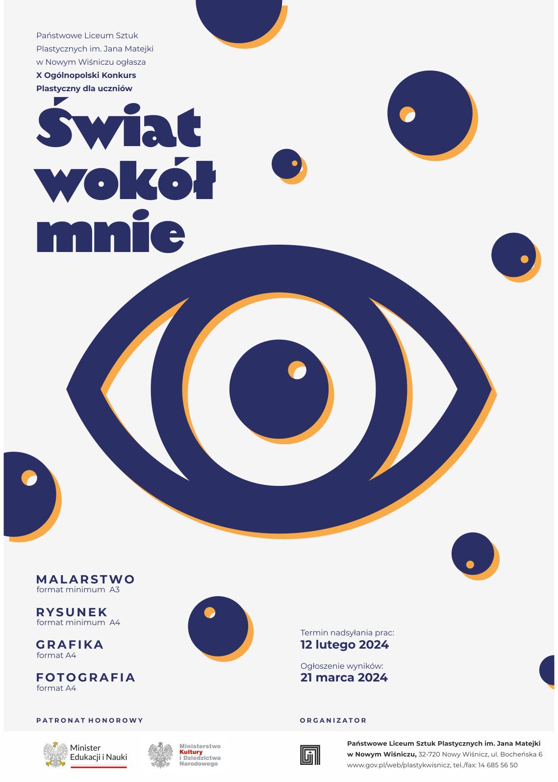 Państwowe Liceum Sztuk Plastycznych im. Jana Matejki w Nowym Wiśniczu zaprasza uczniów klas siódmych i ósmych szkół podstawowych do udziału w X Ogólnopolskim Konkursie Plastycznym „Świat wokół mnie” 2024.