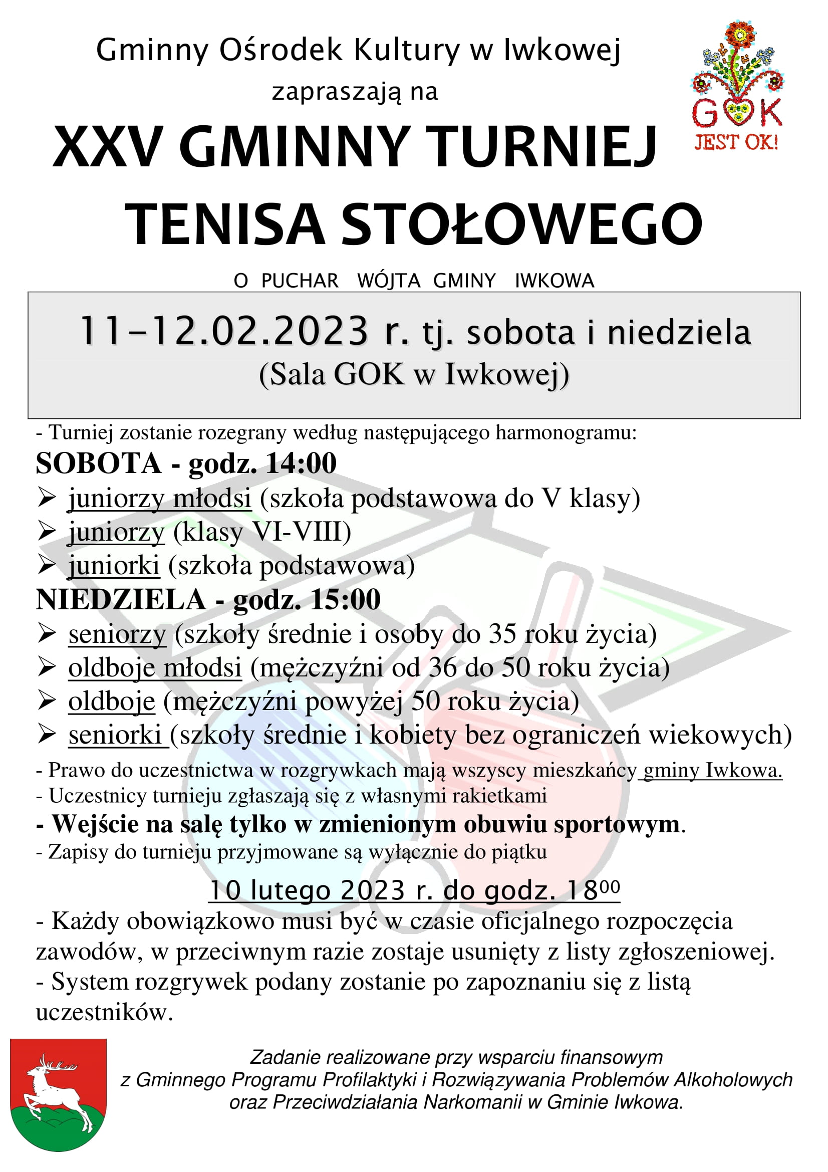 Na zakończenie ferii, jak co roku w Iwkowej odbędzie się Turniej Tenisa Stołowego o Puchar Wójta Gminy Iwkowa. Turniej jest organizowany po raz 25!