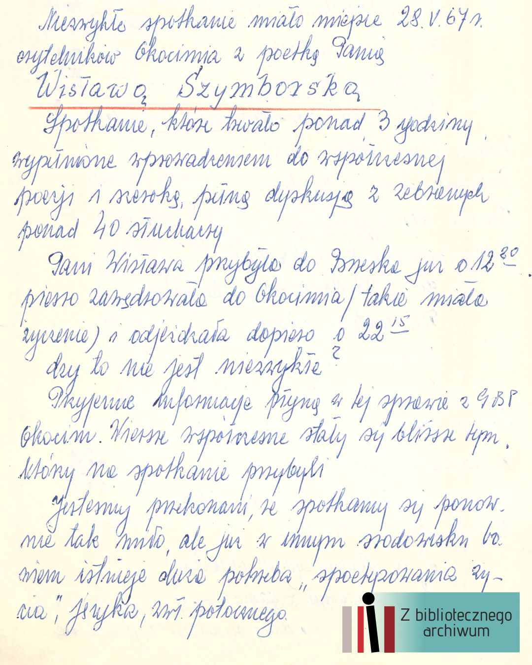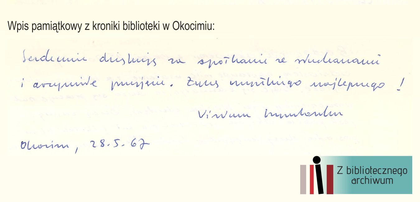Do spotkania autorskiego z Szymborską w Brzesku niestety nigdy nie doszło, cieszy jednak fakt, że już w latach 60. miało ono miejsce w Okocimiu, stwarzając lokalnej społeczności okazję do obcowania z poezją i dyskusji. Wspaniałą pamiątką są także zachowane w bibliotecznych kronikach wpisy gości, opisy wydarzeń przygotowywane przez bibliotekarzy oraz zdjęcia.