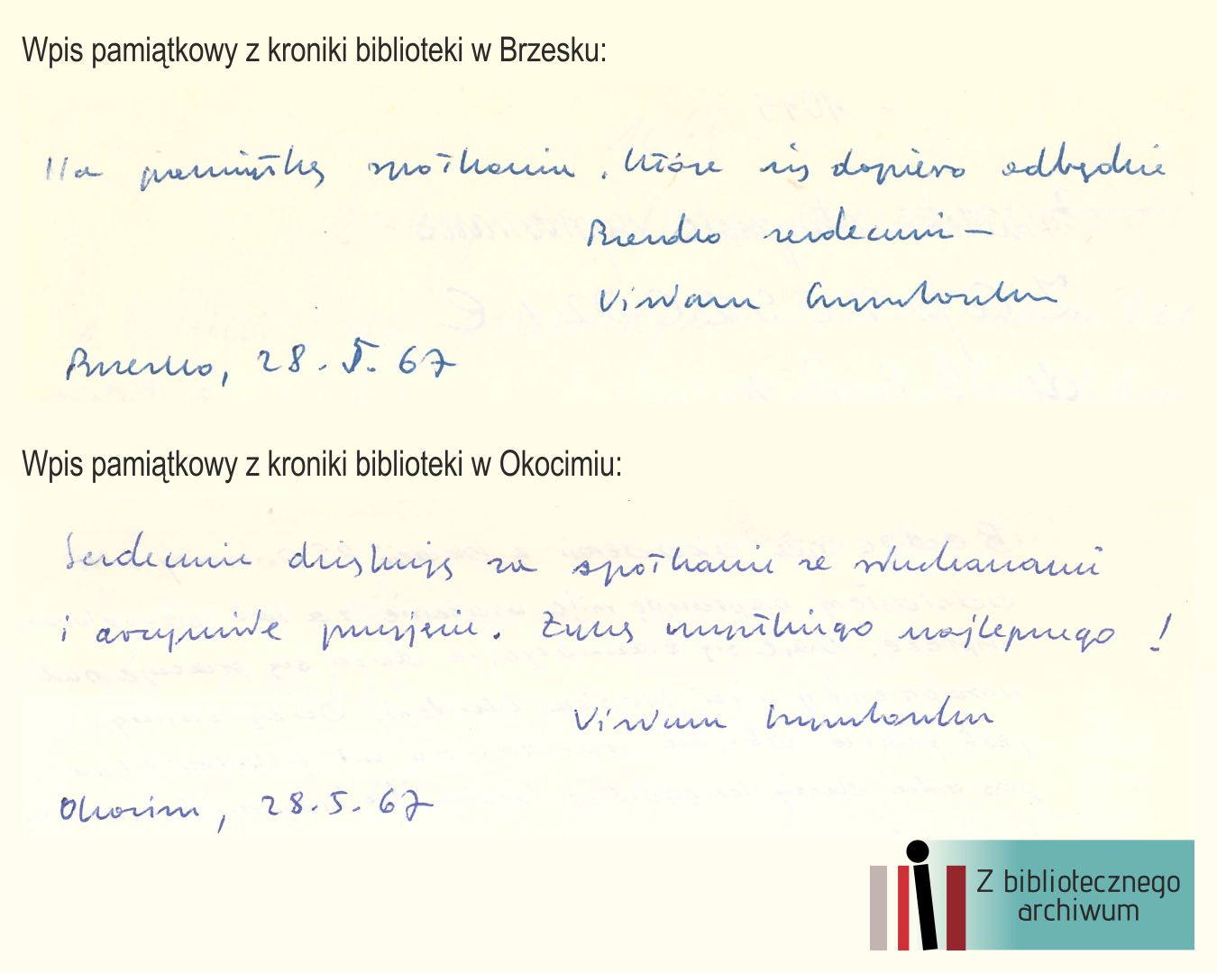 Informacje o tym zdarzeniu odnaleźć można w jednej z kronik brzeskiej biblioteki, jest tam także wpis poetki, która w drodze do Okocimia odwiedziła bibliotekę przy ulicy Puszkina. W notatce poświęconej wizycie Wisławy Szymborskiej pracownik prowadzący kronikę zapisał: „Jesteśmy przekonani, że spotkamy się ponownie tak miło, ale już w innym środowisku bowiem istnieje duża potrzeba „spoetyzowania życia”, języka, zwł. potocznego”.