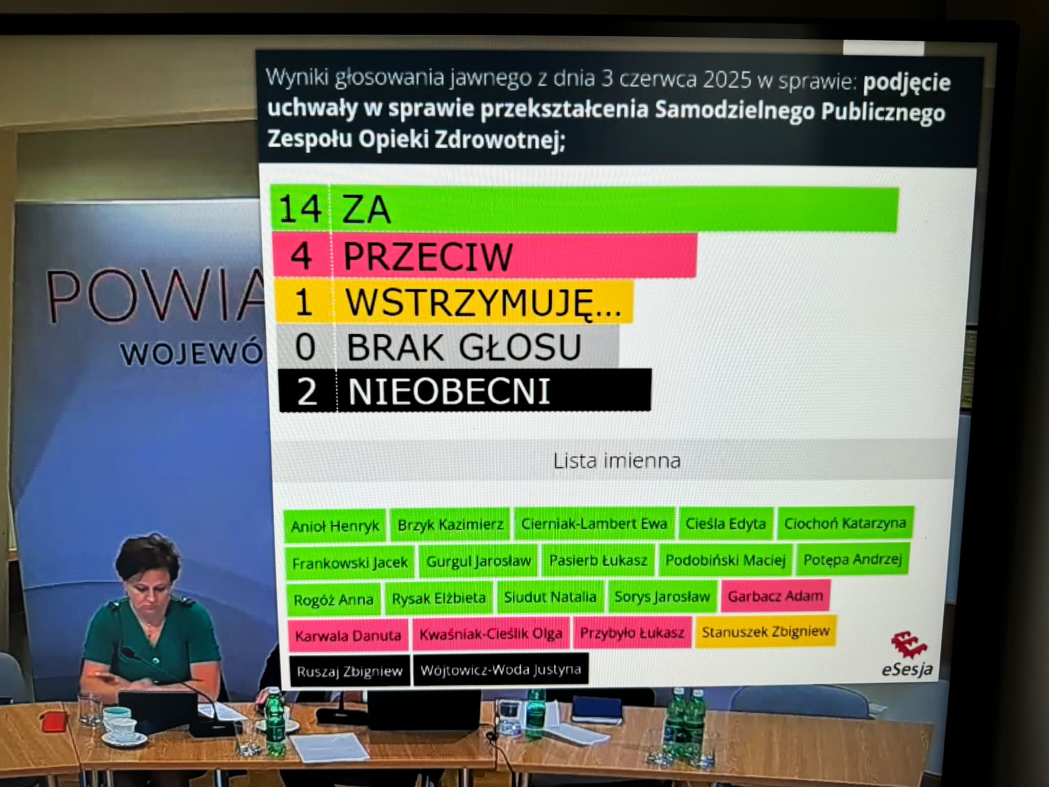 Za przekształceniem oddziału było 14 radnych, 4 było przeciw, 1 osoba się wstrzymała a 2 osoby były nieobecne.