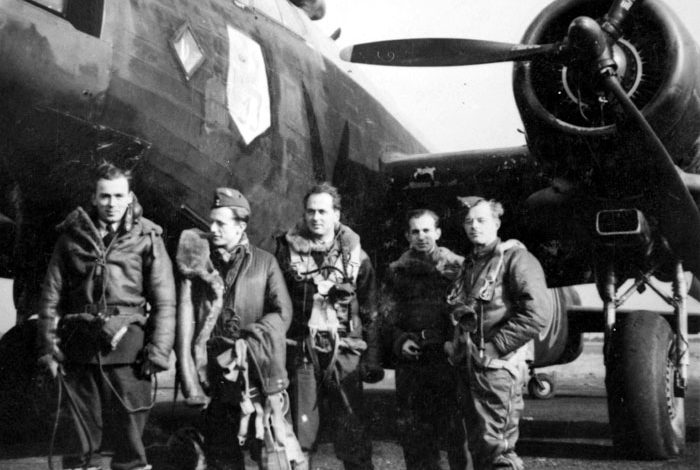 Od lewej: plut. Aleksander Anderman, ppor. pil. Mieczysław Stachiewicz, por. strz. Roman Lipczyński, sierż. rtg. Piotr Kosiń, por. obs. Roman Chmiel (zdjęcie zrobił piąty członek załogi, sierż. strz. Piotr Straub). Lotnicy stoją przy Wellingtonie IV GR-O (Z1337). Hemswell, czerwiec 1942 r.