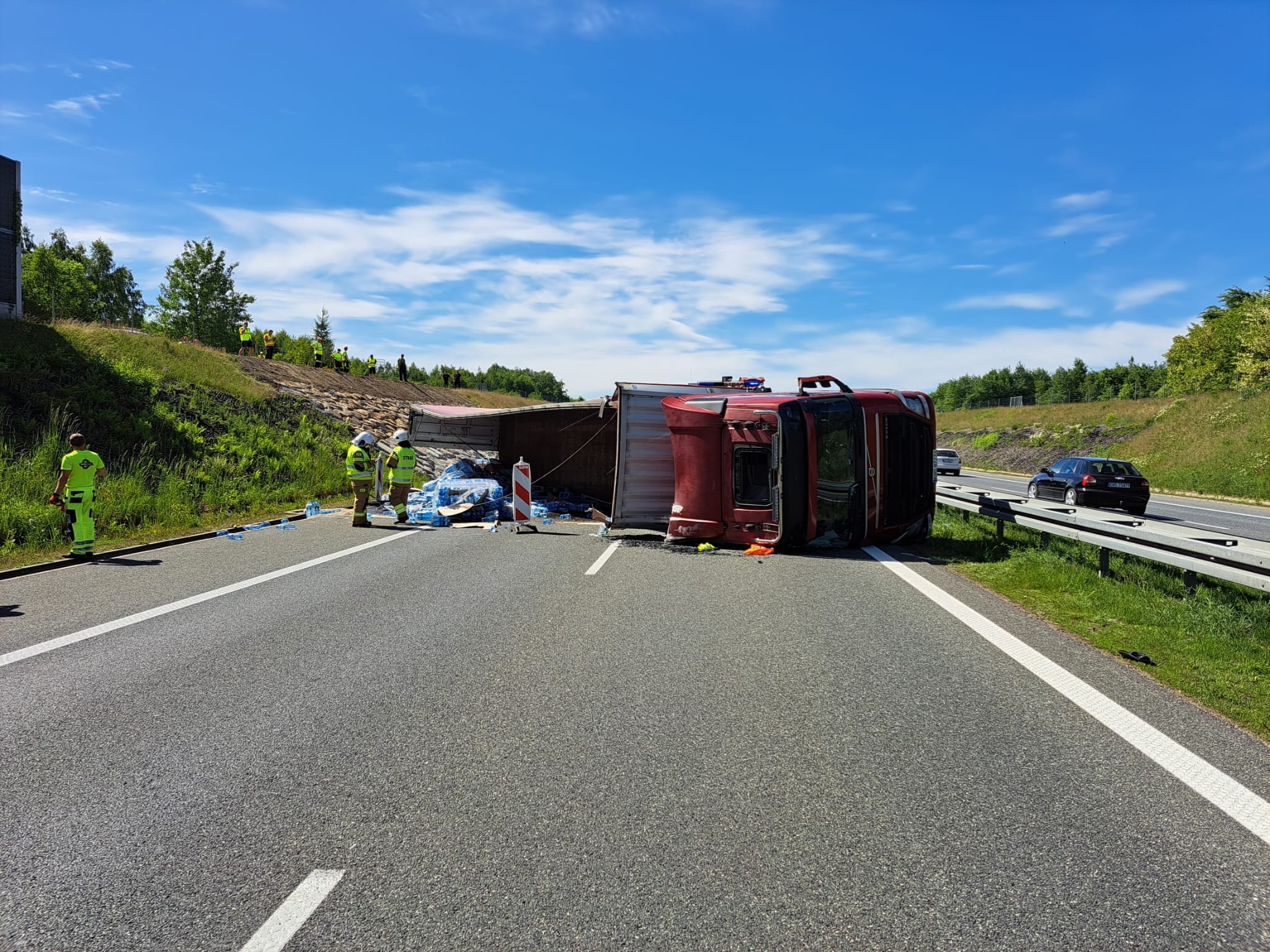 Za węzłem Bochnia kierowca ciężarówki przewrócił zestaw i blokuje całą szerokość autostrady. Kierowca przetransportowany do szpitala, jego życiu nie zagraża niebezpieczeństwo.