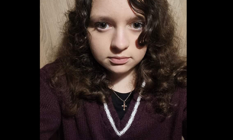 Agnieszka Kuś 13 lat, wzrost 168 cm, może być ubrana w zielone spodnie dresowe, czarną kurtkę z jasnym kwiatkiem z przodu, niskie, białe buty sportowe oraz kremową czapkę zimową, może posiadać przy sobie brązową torebkę.
