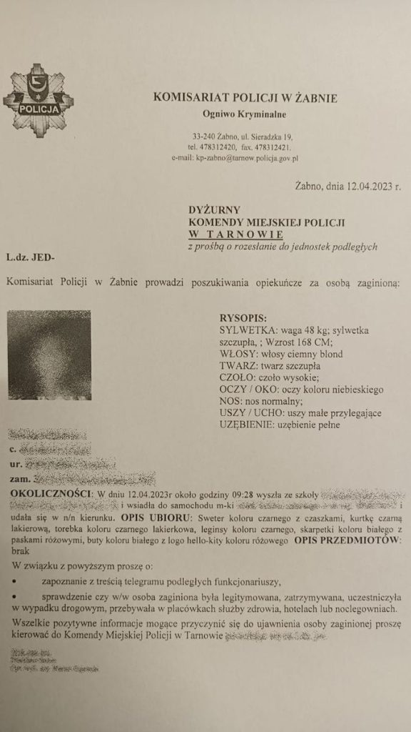 W zeszłym tygodniu policjanci z Żabna w godzinach popołudniowych przyjęli zawiadomienie o zaginięciu dziewczyny z powiatu tarnowskiego. Z przekazanej informacji od matki wynikało, że dziewczyna przed południem wsiadła do samochodu i odjechał w nieznanym kierunku. Matka poinformowała o cechach charakterystycznych oraz ubiorze nastolatki w chwili zaginięcia, a policjanci przystąpili do poszukiwań. Bardzo szybko uzyskali informację o marce samochodu oraz numerach rejestracyjnych. W tym pomógł zabezpieczony monitoring. Następnie ustalono właściciela pojazdu, którym okazał się mieszkaniec Podkarpacia. Rozesłane telegramy do właściwej jednostki pozwoliły na sprawne uzyskanie kluczowych informacji o osobie, która w tym dniu użytkowała samochód zarejestrowany kamerą monitoringu, a także użytkowany przez niego numer telefonu komórkowego. W kolejnych krokach pozostała już tylko rozmowa z kierowcą, który wyjaśnił, że za pośrednictwem popularnej w dzisiejszych czasach aplikacji zgodził się zabrać do Niemiec pasażerów z regionu tarnowskiego. Gdy dowiedział się, że jedzie z nim nieletnia, która aktualnie jest zaginiona zawiózł ją do najbliższej jednostki Policji w Niemczech i przekazał ją niemieckim policjantom. W tym momencie nawiązano współpracę za pośrednictwem Biura Międzynarodowej Współpracy Policji w Polsce i tym samym odpowiednikiem w Niemczech, gdzie nastąpiła weryfikacja poszukiwań oraz identyfikacja przekazanej dziewczyny. W przeciągu kilkunastu godzin od zgłoszonego zaginięcia została ona przekazana pod opiekę matki, która pojechała po nią do Niemiec. Do czasu odebrania przez matkę, zaginiona przebywała w tamtejszym ośrodku dla nieletnich.