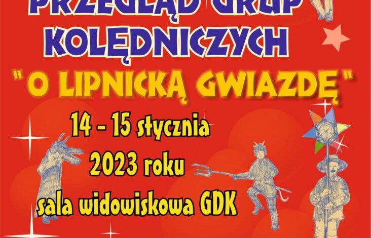 Szczęścia, zdrowia, wszelkiej pomyślności w Nowym Roku i błogosławieństwa Bożego – już po raz czterdziesty pierwszy będą wszystkim Państwu życzyć kolędnicy, którzy w dniach 14-15 stycznia 2023 roku przywędrują do Gminnego Domu Kultury w Lipnicy Murowanej. Właśnie wtedy odbędzie się kolejny MAŁOPOLSKI PRZEGLĄD GRUP KOLĘDNICZYCH „O LIPNICKĄ GWIAZDĘ”, w czasie którego będzie kultywowana piękna i prastara tradycja chodzenia po kolędzie, od domu do domu z radosną nowiną o narodzeniu Pana.