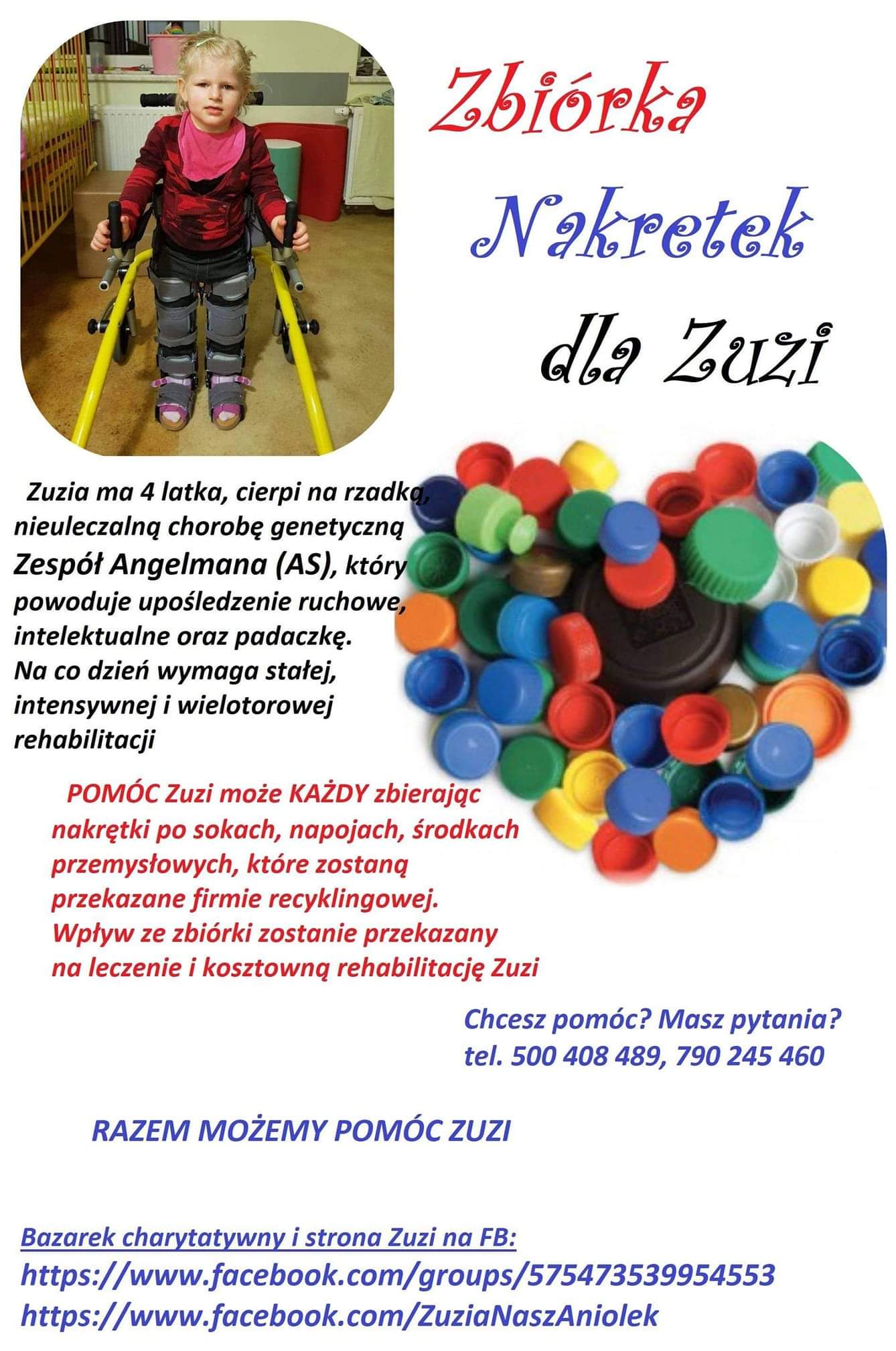 Zuzia choruje na rzadką i nieuleczalną chorobę genetyczną Zespół Angelmana. Objawy tej choroby to niepełnosprawność ruchowa, intelektualna oraz padaczka. Zuzia, mimo że ma 4 latka w dalszym ciągu nie chodzi, nie mówi, a jej rozwój psychoruchowy jest znacznie opóźniony. Obecnie jest na etapie rozwoju 10-miesięcznego dziecka. Jest pod opieką wielu lekarzy specjalistów, a na co dzień wymaga stałej, intensywnej i wielotorowej rehabilitacji oraz specjalistycznego sprzętu rehabilitacyjnego. Codziennie rehabilitowana dzielnie walczy o większą samodzielność i lepszy komfort życia.