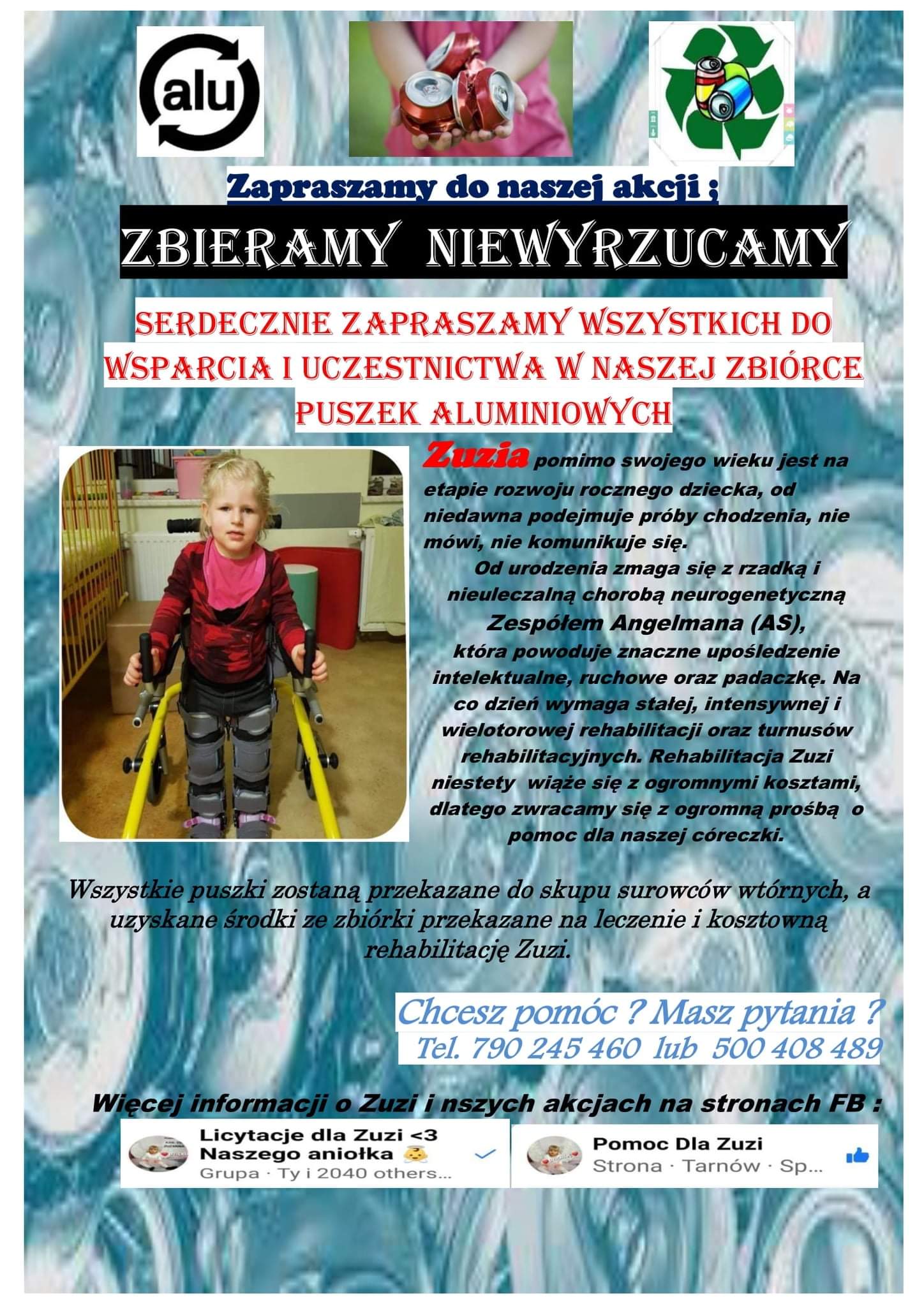 Rodzice Zuzi od kilku lat walczą o lepszą przyszłość dla swojej córeczki. Starają się o 1% z podatku, organizują zbiórki i kiermasze, zbierają nakrętki i plastiki, a ostatnio rozwijają zbiórkę puszek aluminiowych. W ten sposób chcą pozyskać niezbędne środki na rehabilitację i konieczny sprzęt. Wesprzyjmy ich wysiłek i pomóżmy im w tym.