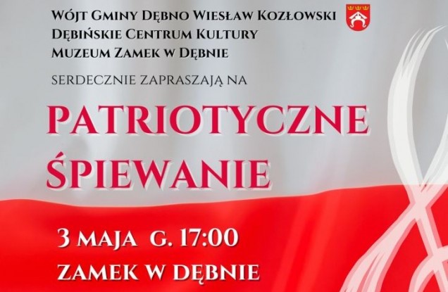 Wójt Gminy Dębno Wiesław Kozłowski, Dębińskie Centrum Kultury oraz Muzeum Ziemi Tarnowskiej serdecznie zapraszają na „Patriotyczne Śpiewanie” najpiękniejszych polskich pieśni patriotycznych w murach dębińskiego zamku.
