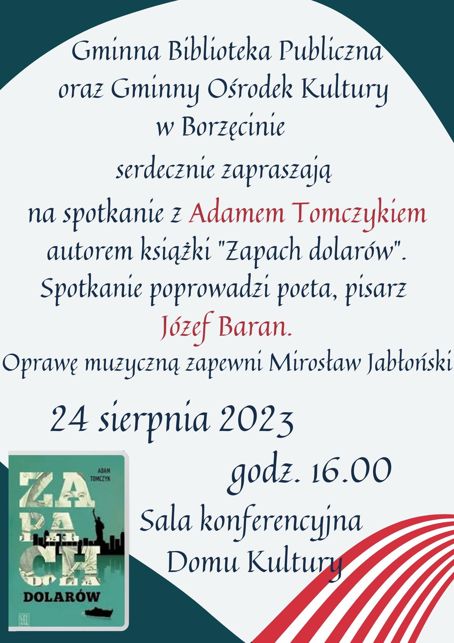 Serdecznie zapraszamy na spotkanie promujące najnowszą książkę Adama Tomczyka „Zapach dolarów”. Spotkanie odbędzie się 24 sierpnia (czwartek) 2023 r. o godzinie 16.00 w sali widowiskowej Domu Kultury w Borzęcinie. Poprowadzi je znakomity poeta Józef Baran, artystycznie śpiewem i grą na gitarze ubogaci Mirosław Jabłoński.