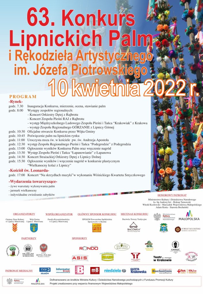 Od godziny 7:30 będą miały miejsce: mierzenie, stawianie i ocena tradycyjnych, lipnickich palm wielkanocnych przygotowanych przez nieocenionych twórców ludowych. Od godziny 8 na scenie zaprezentują się: Orkiestra Dęta z Rajbrotu, Zespół Pieśni RAJ z Rajbrotu, Międzyszkolny Ludowy Zespół Pieśni i Tańca KRAKOWIAK z Krakowa oraz Zespół Regionalny GÓRZANIE z Lipnicy Górnej. Oficjalnego otwarcia Konkursu o godzinie 10:30 dokona Gospodarz Gminy – Pan Tomasz Gromala. Następnie na rynku będzie miało miejsce poświęcenie palm, po którym z procesją udamy się, na uroczystą Mszę św. do kościoła parafialnego pw. św. Andrzeja Ap. O godzinie 12:30 na scenie zaprezentuje się Zespół Regionalny Pieśni i Tańca PODEGRODZIE z Podegrodzia, po którym Komisja Artystyczna przekaże wyniki 63. Konkursu Lipnickich Palm. Na estradzie w dalszej części zaprezentują się: Zespół Pieśni i Tańca ŁAPANOWIANIE z Łapanowa, a także Strażacka Orkiestra Dęta z Lipnicy Dolnej. Około godziny 15:30 poznamy zaś laureatów konkursu plastycznego „Wielkanocny kolaż z Lipnicy”. O godzinie 17:00 zapraszamy z kolei do naszej perły architektury drewnianej – kościółka św. Leonarda na wyjątkowy koncert „Na skrzydłach muzyki” w wykonaniu Wiśnickiego Kwartetu Smyczkowego. Gorąco zapraszamy również na jarmark wielkanocny, żywe warsztaty wykonywania palm, a także indywidualne zwiedzanie zabytków Lipnicy.