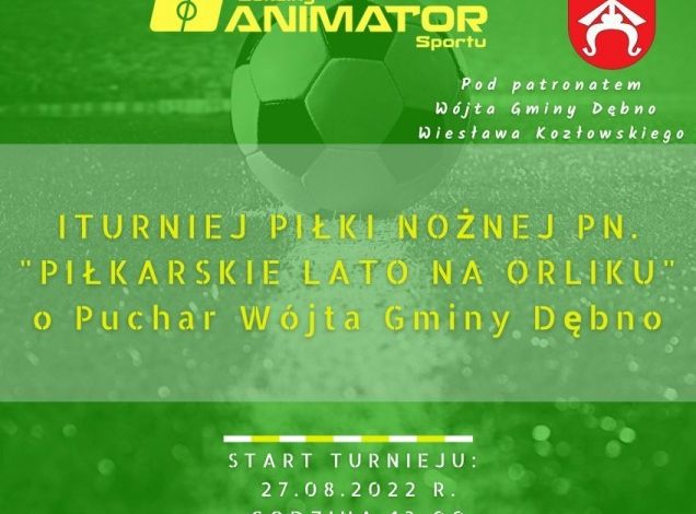 W sobotę, 27 sierpnia 2022 r. o godz. 13:00 na obiekcie „Moje boisko Orlik 2012” w Dębnie odbędzie się I Turniej Piłki Nożnej pn. „Piłkarskie lato na orliku” o Puchar Wójta Gminy Dębno. W zawodach uczestniczyć mogą drużyny z terenu naszej gminy składające się z mieszkańców gminy. Składy mogą być uzupełnione graczami spoza terenu gminy na zasadach opisanych w regulaminie.