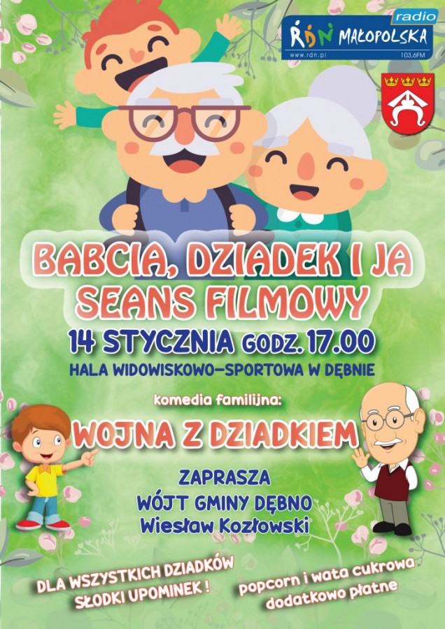 Wielkimi krokami zbliżają się dwa wyjątkowe dni – Dzień Babci i Dziadka. Gmina Dębno, chcąc pokazać jak ważną rolę odgrywają w życiu swoich wnuków, przygotowała komedię familijną pn. „Wojna z dziadkiem”. Wydarzenie odbędzie się 14 stycznia 2023 r. o godz. 17.00 na Hali Widowiskowo – Sportowej w Dębnie. To jeszcze nie koniec atrakcji, ponieważ dla każdej Babci i każdego Dziadka, który spędzi ten wieczór ze swoimi wnukami na Hali w Dębnie przygotowano słodki upominek.