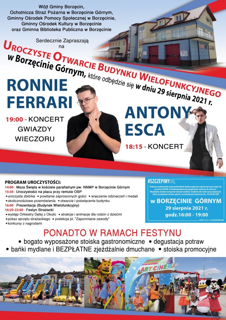 W niedzielę, 29 sierpnia w Borzęcinie odbędzie się uroczyste otwarcie Budynku Wielofunkcyjnego połączone z Festynem Strażackim. W ramach festynu m.in.: koncerty Antony Esca i gwiazdy wieczoru RONNIE FERRARI, występ Orkiestry Dętej z Okulic, atrakcje i animacje dla rodzin z dziećmi, pokaz sprzętu strażackiego, prelekcja pt. „Zapomniane zawody” oraz liczne konkursy z nagrodami.