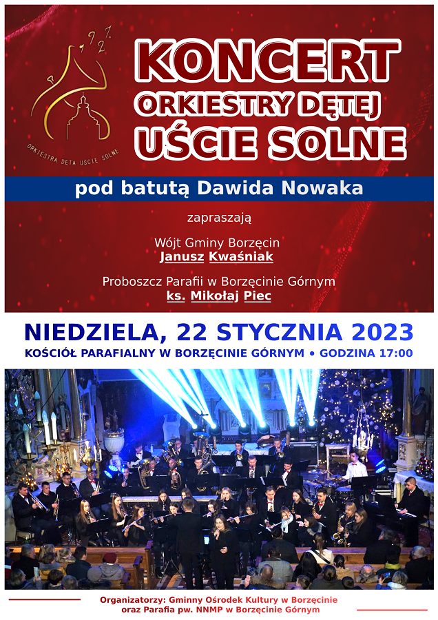 W niedzielę 22 stycznia br. o godz. 17:00 zapraszamy do Kościoła Parafialnego w Borzęcinie Górnym na wyjątkowy koncert w wykonaniu Orkiestry Dętej Uście Solne i solistów pod batutą Dawida Nowaka.