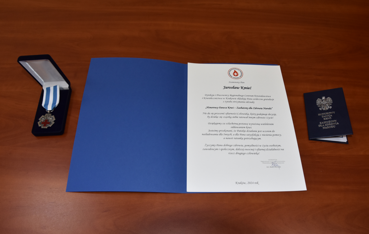 W piątek (14 czerwca br.) na terenie Krakowa odbyła się uroczystość w trakcie której rozdane zostały odznaki za bardzo wyjątkowe osiągnięcie związane z pomocą osobom potrzebującym. Tego dnia w samo południe z inicjatywy ministra zdrowia nadano odznaki „Honorowy Dawca Krwi – Zasłużony dla zdrowia narodu”. Warunkiem koniecznym otrzymania pamiątkowego medalu jest oddanie 20 litrów krwi. Wśród osób, które otrzymały powyższe wyróżnienie był Komendant Powiatowy Policji w Bochni podinsp. Jarosław Kmieć. Nowy szef bocheńskiej policji pierwszy raz krew oddał w październiku 1994 roku jeszcze jako cywil. Od tego czasu w punktach krwiodawstwa i późniejszych policyjnych akcjach krwiodawstwa zostawił 20 litrów ratującej zdrowie i życie krwi, deklarując jednocześnie, że ilość ta w najbliższym czasie regularnie będzie się powiększać.