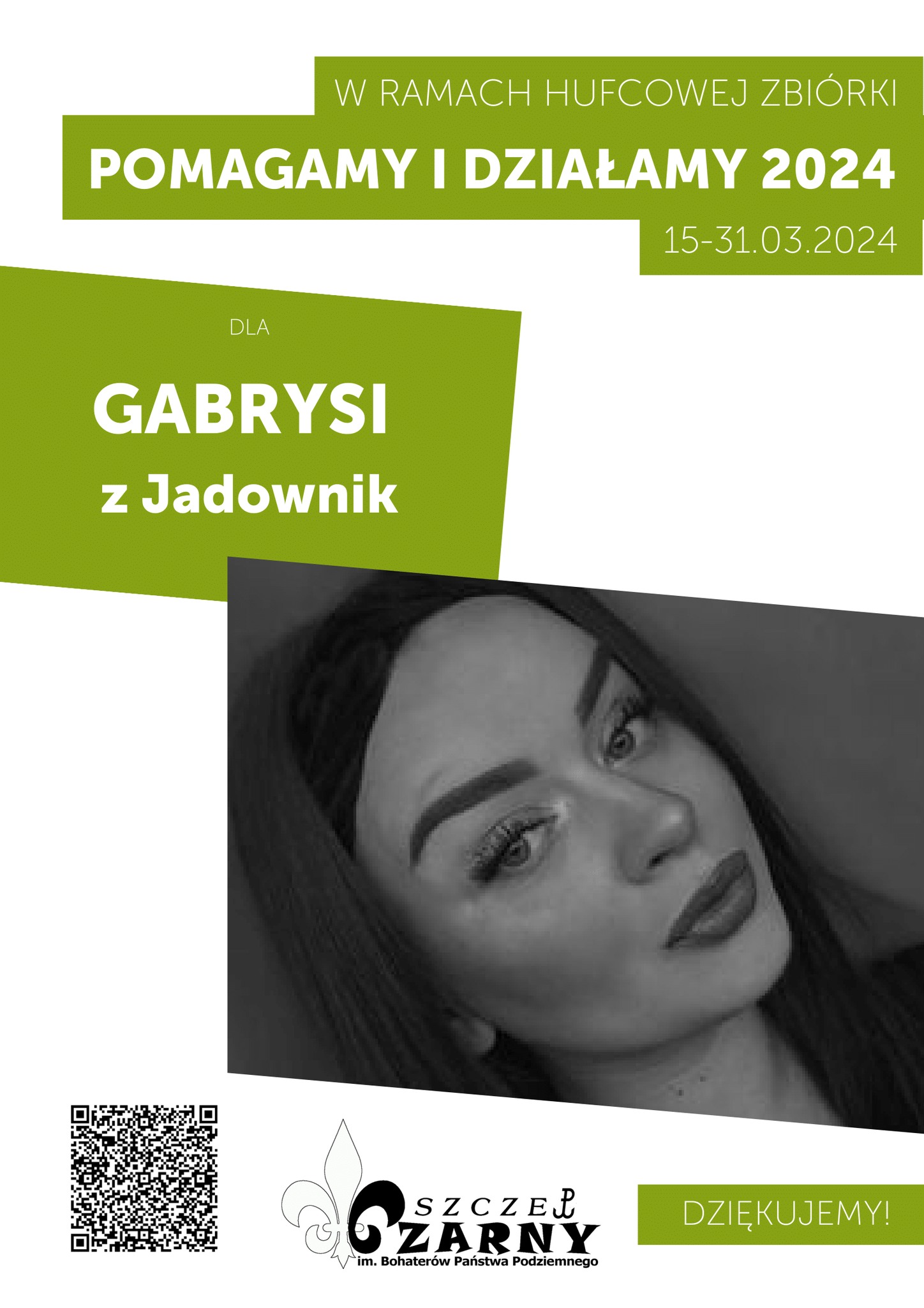 W piątek 15 marca 2024 r. harcerze i zuchy ze Szczepu Czarnego z Jadownik rozpoczynają kolejną edycję hufcowej zbiórki publicznej „Pomagamy i działamy”. W tym roku Szczep Czarny chce pomóc 22-letniej Gabrysi pochodzącej z Jadownik, która na początku stycznia 2024 r. temu doznała bardzo poważnego wypadku i cudem uszła z życiem.