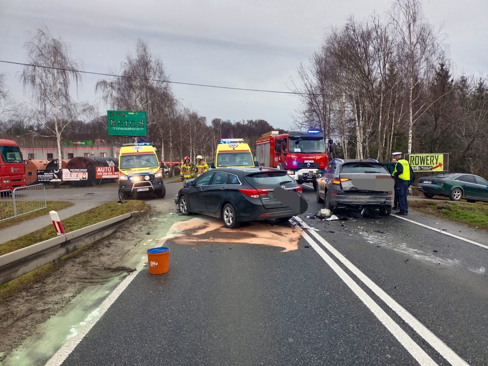W wyniku wypadku droga została całkowicie zablokowana. Na jezdnię rozlały się płyny eksploatacyjne z rozbitych pojazdów.
