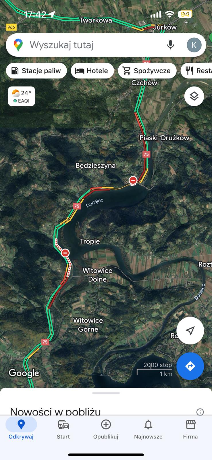 Mapa natężenia ruchu na drodze krajowej nr 75 w Czchowie/ 7 kwietnia 2024 r. Godz. 17.30