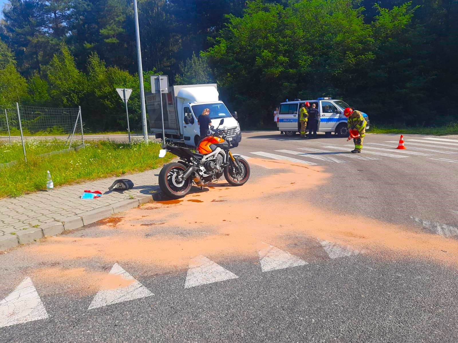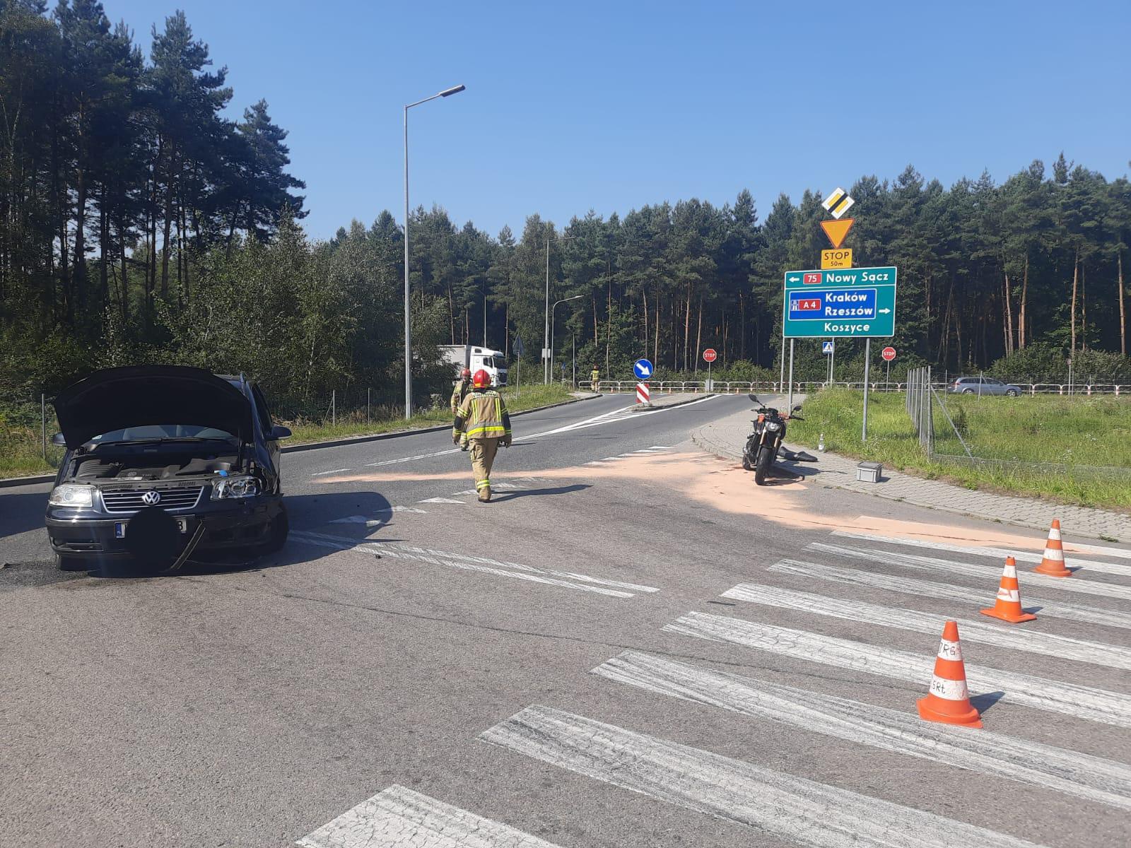 Zderzenie motocyklisty i samochodu osobowego na skrzyżowaniu Leśnej i Gajowej w Brzesku / 29 sierpnia 2024 r.