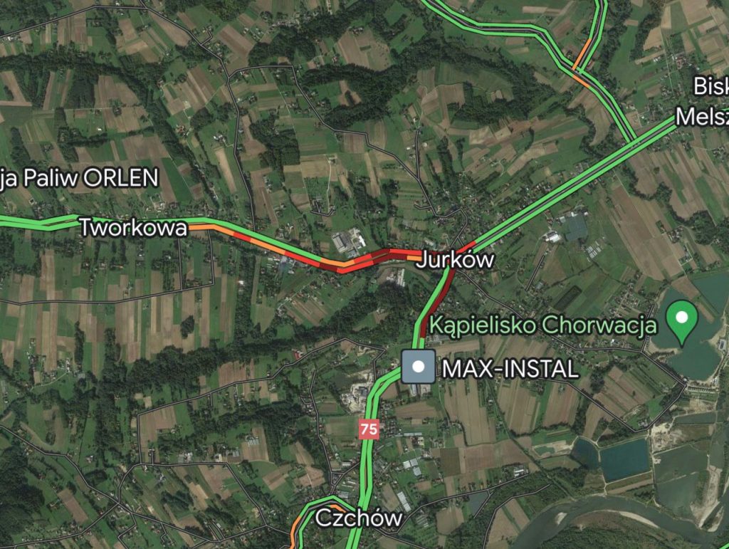 Mapa natężenia ruchu na drodze krajowej nr 75 w Jurkowie / 6 lutego 2023 r. Godz. 15.35