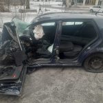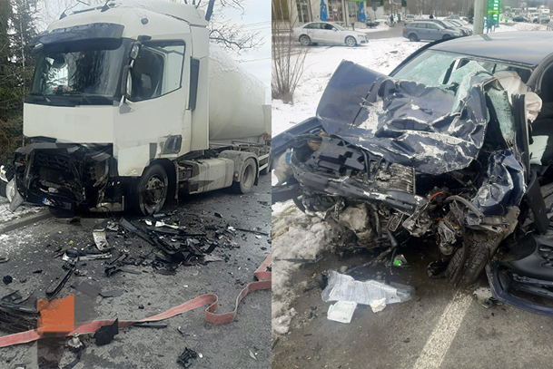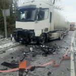 W wyniku zderzenia samochodu osobowego z ciężarowym jedna osoba została poszkodowana i zakleszczona w pojedzie. Konieczne było użycie hydraulicznych narzędzi ratowniczych.