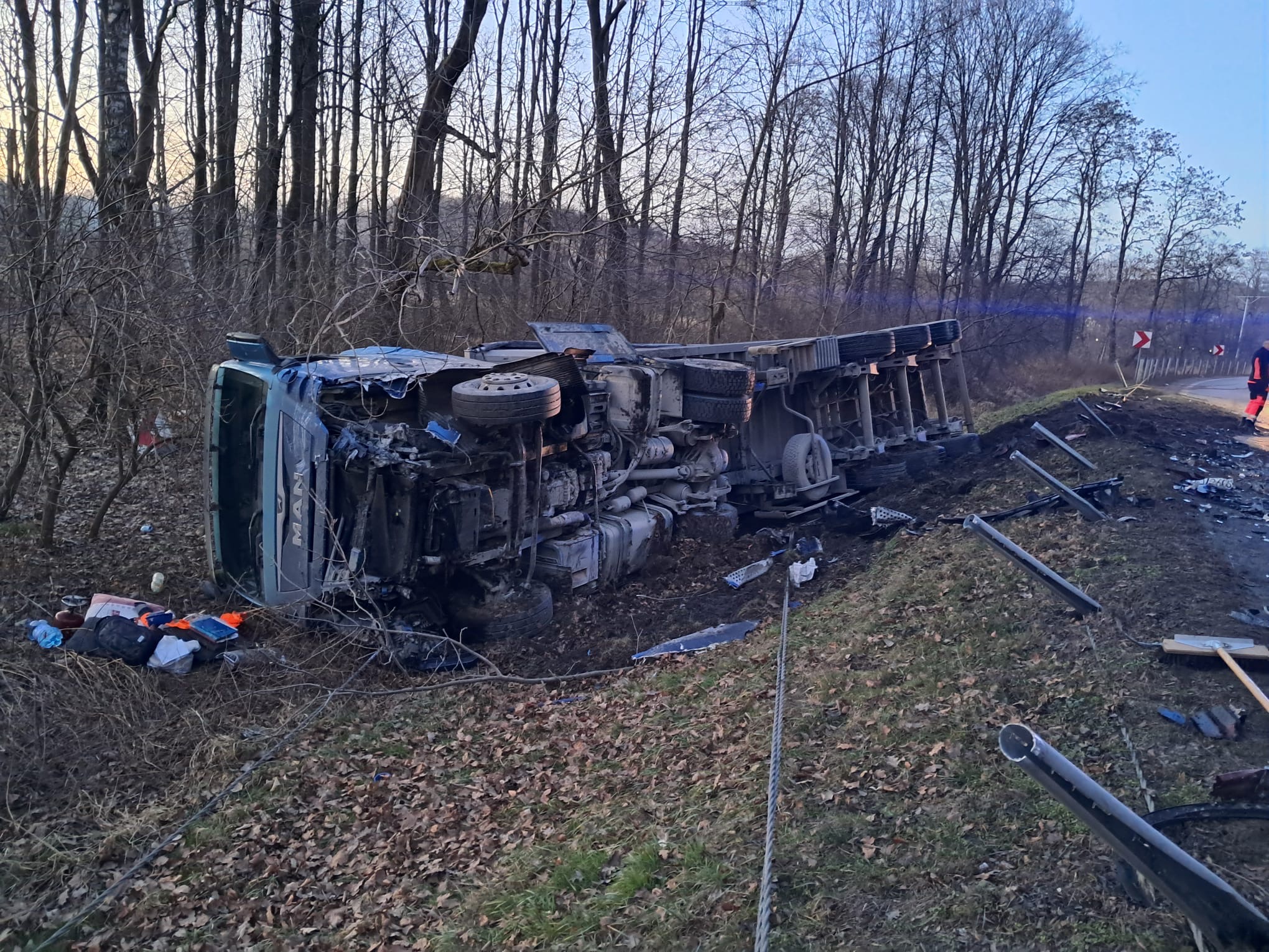 W następstwie zderzenie ciężarówka ścięła bariery linowe i przewróciła się do przydrożnego rowu.
