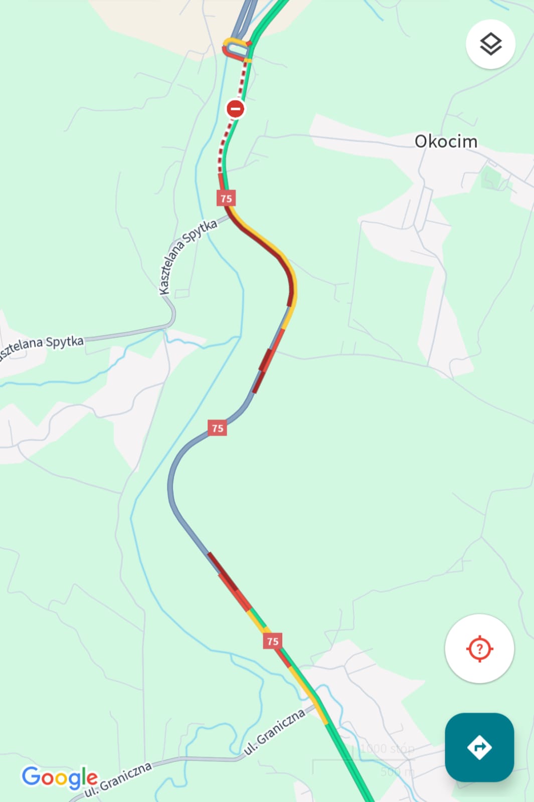 Mapa natężenia ruchu na drodze krajowej nr 75 w Okocimiu – godz. 17.30 / 30 stycznia 2025 r.