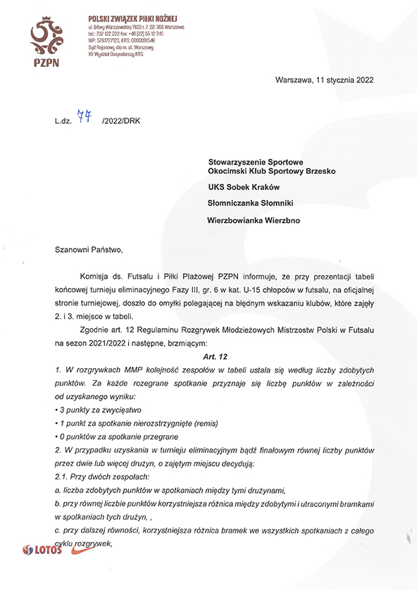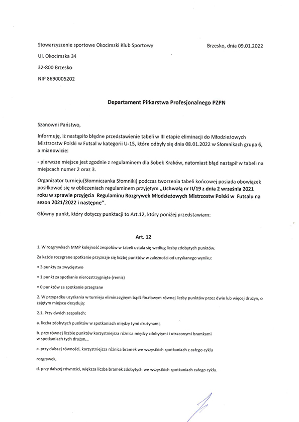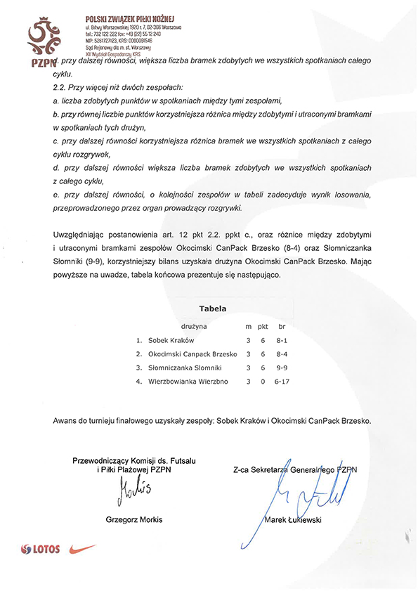 Poniżej przedstawiamy pisma, w tym potwierdzenie Komisji ds. Futsalu i Piłki Plażowej PZPN o awansie Okocimskiego do fazy finałowej: