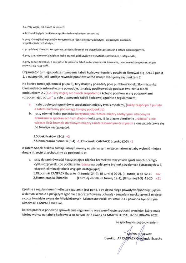 Złożenie odwołania było naszym obowiązkiem, ale odwołanie to, nie zawsze sukces dlatego bardzo dziękuję Komisji Futsalu i Piłki Plażowej PZPN za pozytywne i odpowiedzialne podejście do sprawy. Widać, że regulaminy są rzeczą świętą i Komisja uznała naszą rację.
