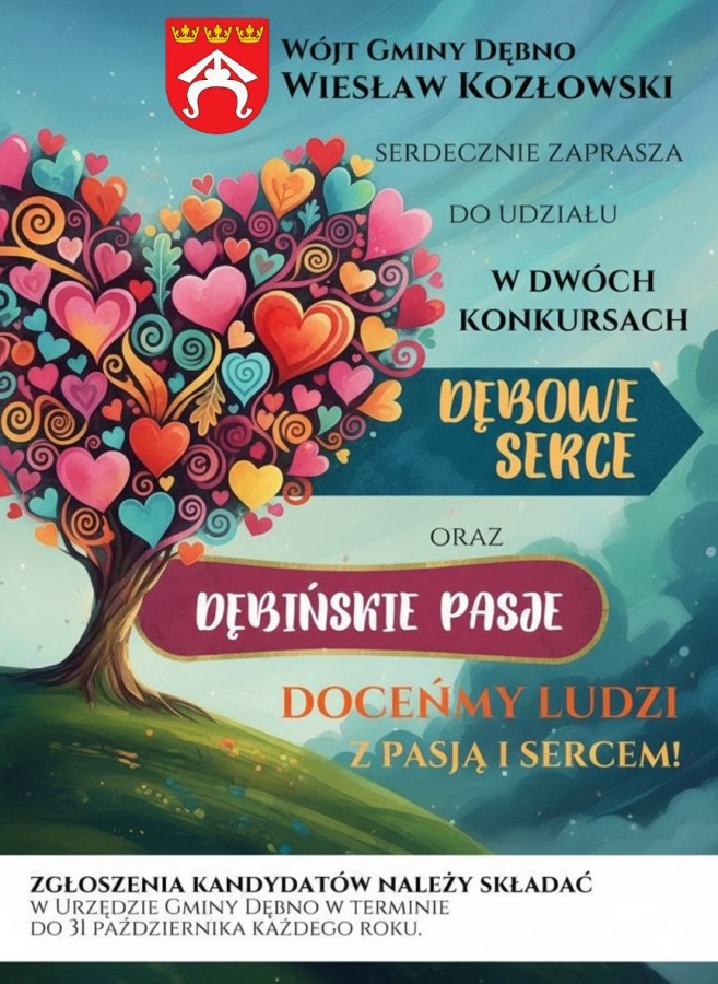 Wójt Gminy Dębno Wiesław Kozłowski, serdecznie zaprasza mieszkańców do zgłaszania kandydatów do nagród „Dębowe Serce” oraz „Dębińskie Pasje”.