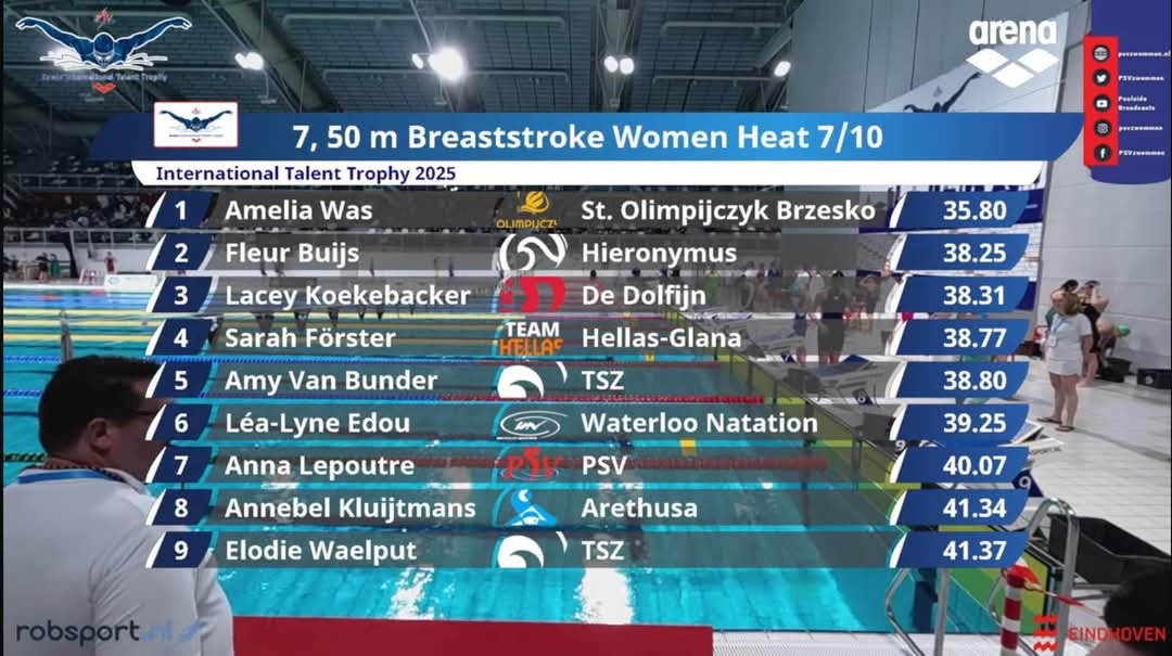 Pierwsze miejsce i historyczny rekord zawodów Arena International Talent Trophy 2025 wywalczyła w holenderskim Eindhoven Amelia Wąs, zawodniczka klubu pływackiego Stowarzyszenie Olimpijczyk Brzesko.