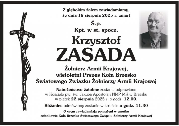 18 sierpnia 2025 r. w godzinach wczesnoporannych odszedł na wieczną wartę żołnierz Armii Krajowej kpt. w stanie spoczynku Krzysztof Zasada, długoletni prezes brzeskiego koła Światowego Związku Żołnierzy Armii Krajowej.