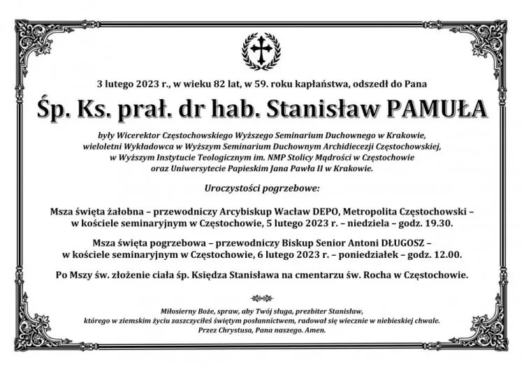 Mszy św. żałobnej w niedzielę, 5 lutego 2023 r. o godz. 19.30 w kościele seminaryjnym Wyższego Międzydiecezjalnego Seminarium Duchownego w Częstochowie będzie przewodniczył abp Wacław Depo, metropolita częstochowski.