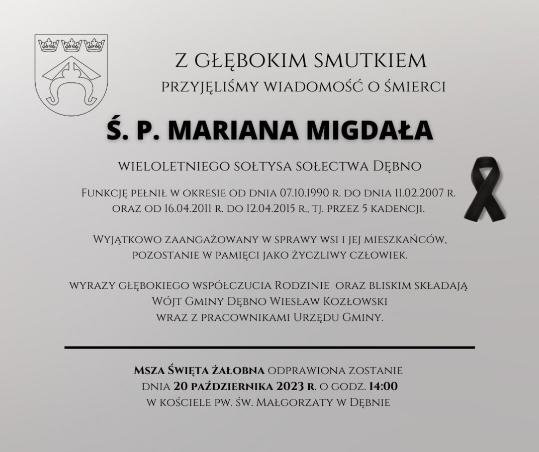 Z przykrością zawiadamiamy, że w dniu 17 października 2023 r. w wieku 82 lat zmarł Pan Marian Migdał – wieloletni sołtys sołectwa Dębno.
