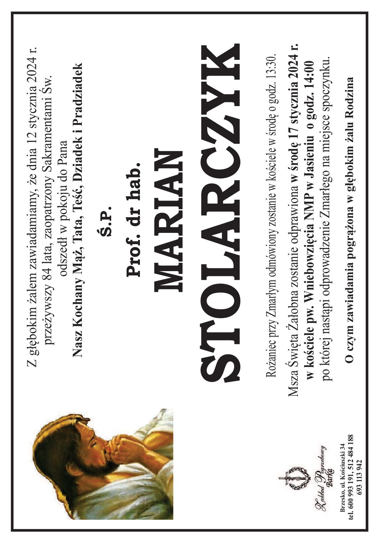 Profesor Marian Stolarczyk urodził się 12 stycznia 1940 r. w Jasieniu – Kopalinach, w powiecie brzeskim, w Małopolsce. Szkołę podstawową i liceum ukończył w Brzesku, studia historyczne w Wyższej Szkole Pedagogicznej w Krakowie w 1963 r. Pracował w Zespole Szkół Zawodowych Ministerstwa Przemysłu Chemicznego w Tarnowie, a także, w roku 1971, kierował pracami Archiwum Państwowego w Brzesku. W 1972 roku obronił dysertację doktorską, przygotowaną pod kierunkiem prof. dr hab. Mariana Tyrowicza w WSP w Krakowie. Pracę naukową zdominowały studia nad Polską XIX wieku. Był autorem ponad 100 publikacji naukowych. Był też współautorem monografii Bochni, Brzeska i Tarnowa.
