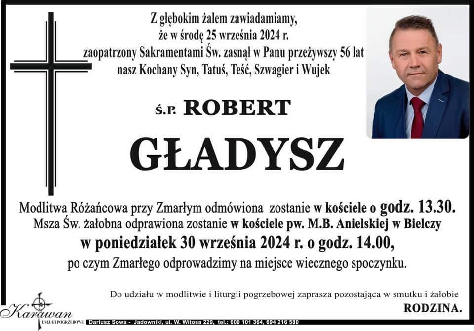 Z głębokim smutkiem i poczuciem ogromnej straty przyjęliśmy wiadomość o śmierci *** Roberta Gładysza *** naszego Kolegi, Przyjaciela, kochającego Ojca, aktywnego samorządowca, wieloletniego Radnego Powiatu Brzeskiego, w latach 2014-2018 Wiceprzewodniczącego Rady Powiatu Brzeskiego, pracownika Wydziału Bezpieczeństwa i Administracji Starostwa Powiatowego w Brzesku, zawsze życzliwego i niezwykle oddanego sprawom społecznym, a także doświadczonego emerytowanego policjanta.