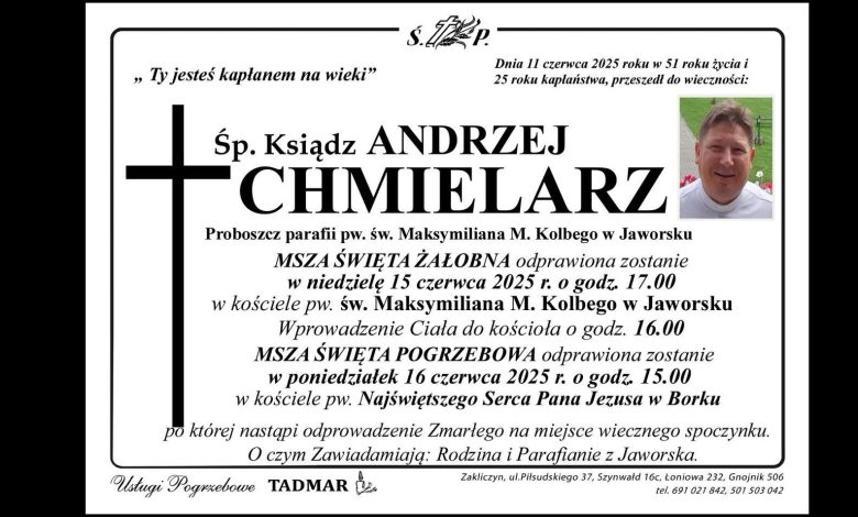 11 czerwca 2025 roku zmarł śp. Ks. mgr Andrzej Chmielarz, proboszcz parafii pw. św. Maksymiliana M. Kolbego w Jaworsku. Msza święta żałobna będzie celebrowana w kościele pw. św. Maksymiliana M. Kolbego w Jaworsku, w niedzielę 15 czerwca, o godz. 17.00. Msza święta pogrzebowa będzie celebrowana w kościele pw. Najświętszego Serca Pana Jezusa w Borku, w poniedziałek 16 czerwca, o godz. 15.00, po czym ciało śp. Zmarłego zostanie złożone na tamtejszym cmentarzu.