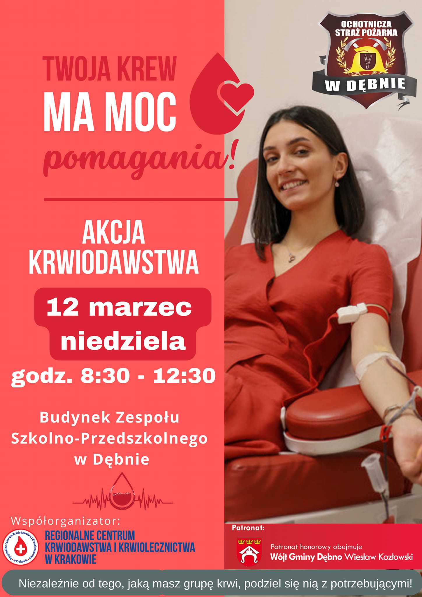 Akcja odbędzie się w budynku Zespołu Szkolno-Przedszkolnego w Dębnie (wejście główne). Poprowadzą ją pracownicy Terenowego Oddziału Regionalnego Centrum Krwiodawstwa i Krwiolecznictwa w Bochni.