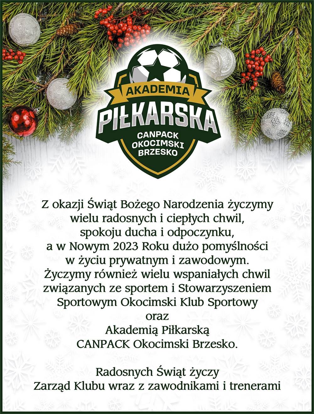 -- Życzenia Boże Narodzenie 2022 - Akademia Piłkarska CANPACK Okocimski Brzesko