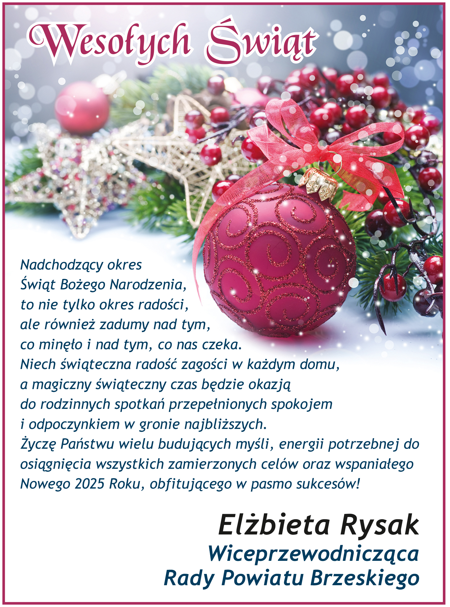 -- Życzenia Boże Narodzenie 2024 - Elżbieta Rysak Wiceprzewodnicząca Rady Powiatu Brzeskiego