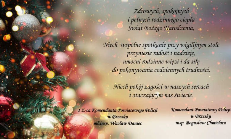 Komendant Powiatowy Policji w Brzesku insp. Bogusław Chmielarz w imieniu własnym oraz kierownictwa komendy składa policjantom, pracownikom cywilnym oraz mieszkańcom Powiatu Brzeskiego życzenia z okazji Świąt Bożego Narodzenia.