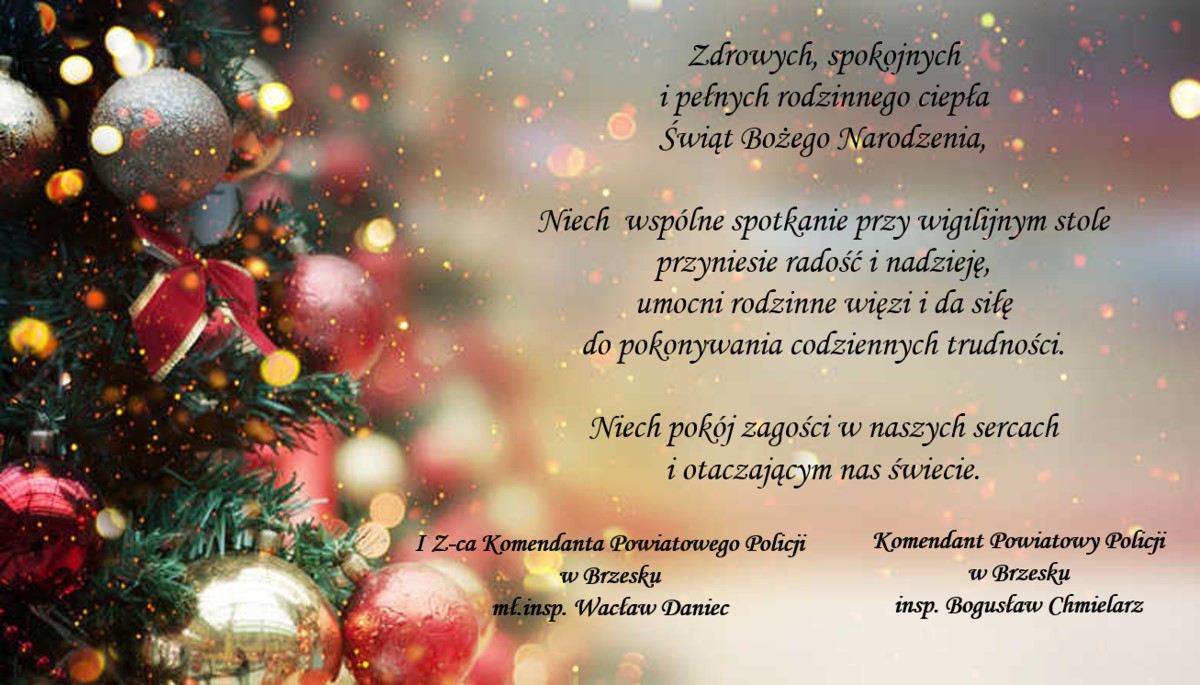 Komendant Powiatowy Policji w Brzesku insp. Bogusław Chmielarz w imieniu własnym oraz kierownictwa komendy składa policjantom, pracownikom cywilnym oraz mieszkańcom Powiatu Brzeskiego życzenia z okazji Świąt Bożego Narodzenia.
